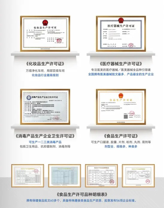 從生產(chǎn)許可方面來(lái)看,義和才銳已具備眾多美麗健康類(lèi)產(chǎn)品的生產(chǎn)資質(zhì)和生產(chǎn)能力,滿(mǎn)足客戶(hù)“生產(chǎn)基地”式合作需求,同時(shí)滿(mǎn)足“內(nèi)調(diào)外養(yǎng)”,兼顧生美和醫(yī)美,線(xiàn)上和線(xiàn)下協(xié)同。